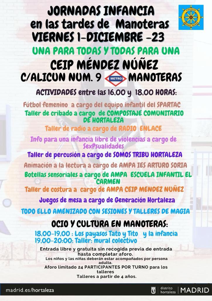 El viernes 1 de diciembre, gracias a Somos Tribu Hortaleza, vuelven las jornadas de ocio y cultura al barrio con Las tardes de Manoteras que, en esta ocasión, acogen diversas actuaciones y talleres infantiles en unas completas Jornadas de la Infancia bajo el lema «Una para todas y todas para una» en el colegio público Méndez Núñez (calle Alicún, 9).