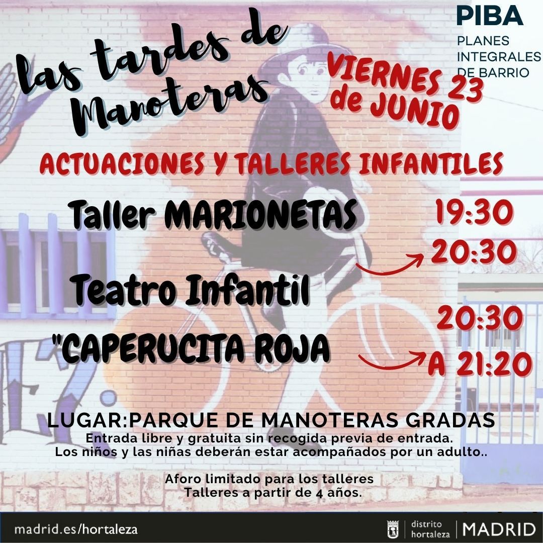El viernes 23 de junio vuelven las jornadas de ocio y cultura al barrio con Las tardes de Manoteras que acogen actuaciones y talleres infantiles, en esta ocasión, con un taller de marionetas y teatro infantil en el parque de Manoteras (calle Vélez Rubio, s/n).