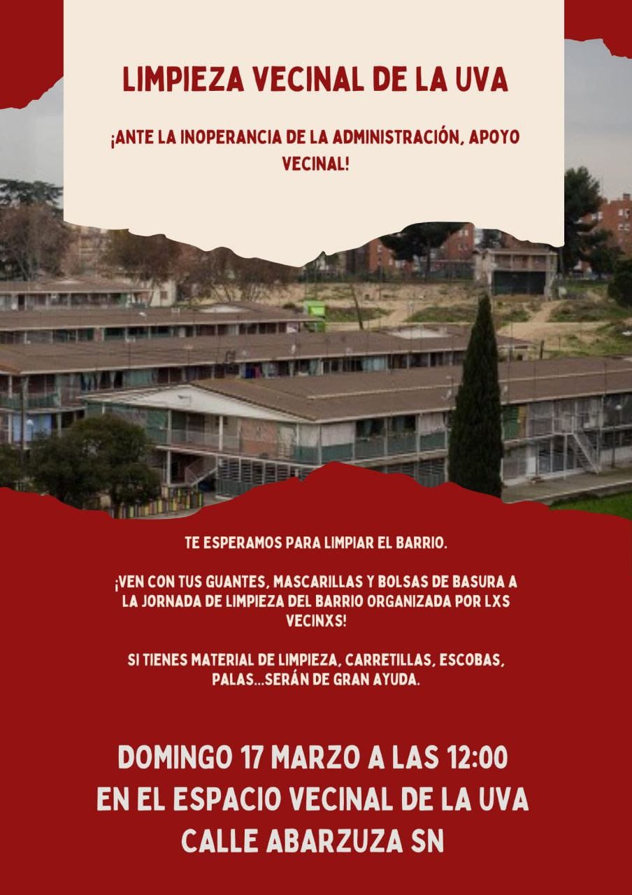 El domingo 17 de marzo a las 12.00 horas, se organiza una jornada de limpieza vecinal de la UVA de Hortaleza, «ante la inoperancia de la Administración».