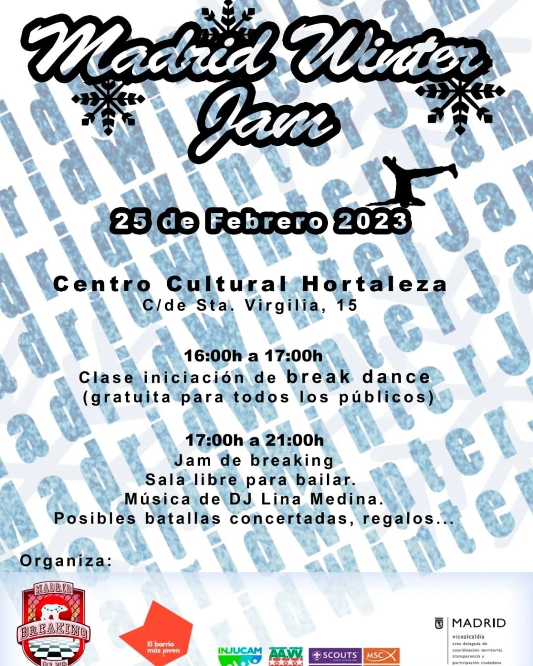 El sábado 25 de febrero desde las 16.00 horas, se celebra una Madrid Winter Jam gratuita en el centro cultural Hortaleza (calle Santa Virgilia, 15), organizada por El Barrio Más Joven en colaboración con Madrid Breaking Club.