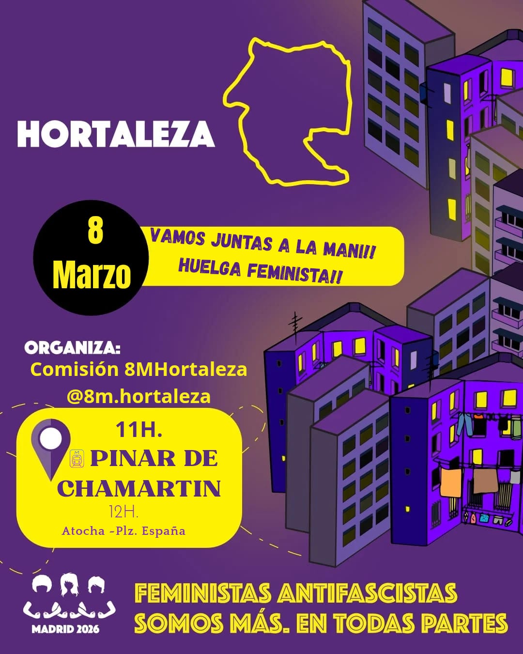 La Comisión 8M Hortaleza convoca un año más a las vecinas del distrito para acudir juntas a la manifestación desde el barrio. La cita es el domingo a las 11.00 horas en el andén de la estación de metro de Pinar de Chamartín (líneas 1 y 4).