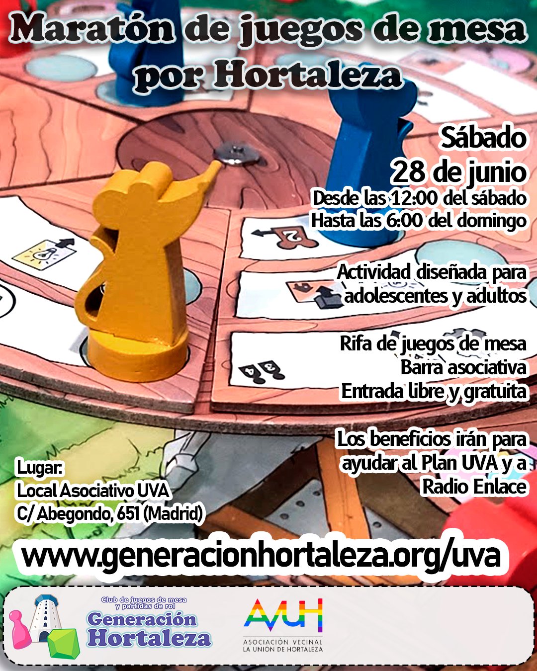Será una gran jornada que pretende ofrecer diversión con juegos de mesa y así recaudar fondos para ayudar a los vecinos de la UVA de Hortaleza en el proceso legal para exigir las casas dignas que se les llevan prometiendo más de 60 años, mientras esperan en casas que inicialmente iban a ser temporales. La ayuda judicial se lleva a cabo mediante el Plan UVA, integrado dentro de la asociación vecinal La Unión de Hortaleza. Además, se busca ayudar a Radio Enlace, la emisora comunitaria del norte de Madrid.