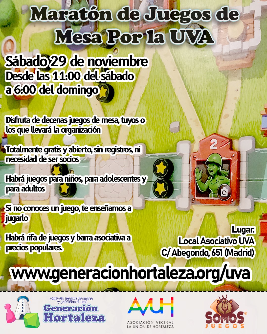 Será una gran jornada que pretende ofrecer diversión con juegos de mesa y así recaudar fondos para ayudar a los vecinos del barrio de la UVA de Hortaleza en el proceso legal para exigir las casas dignas que se les llevan prometiendo más de 60 años, mientras esperan en casas que inicialmente iban a ser temporales. La ayuda judicial se lleva a cabo mediante el Plan UVA, integrado dentro de la asociación vecinal La Unión de Hortaleza.