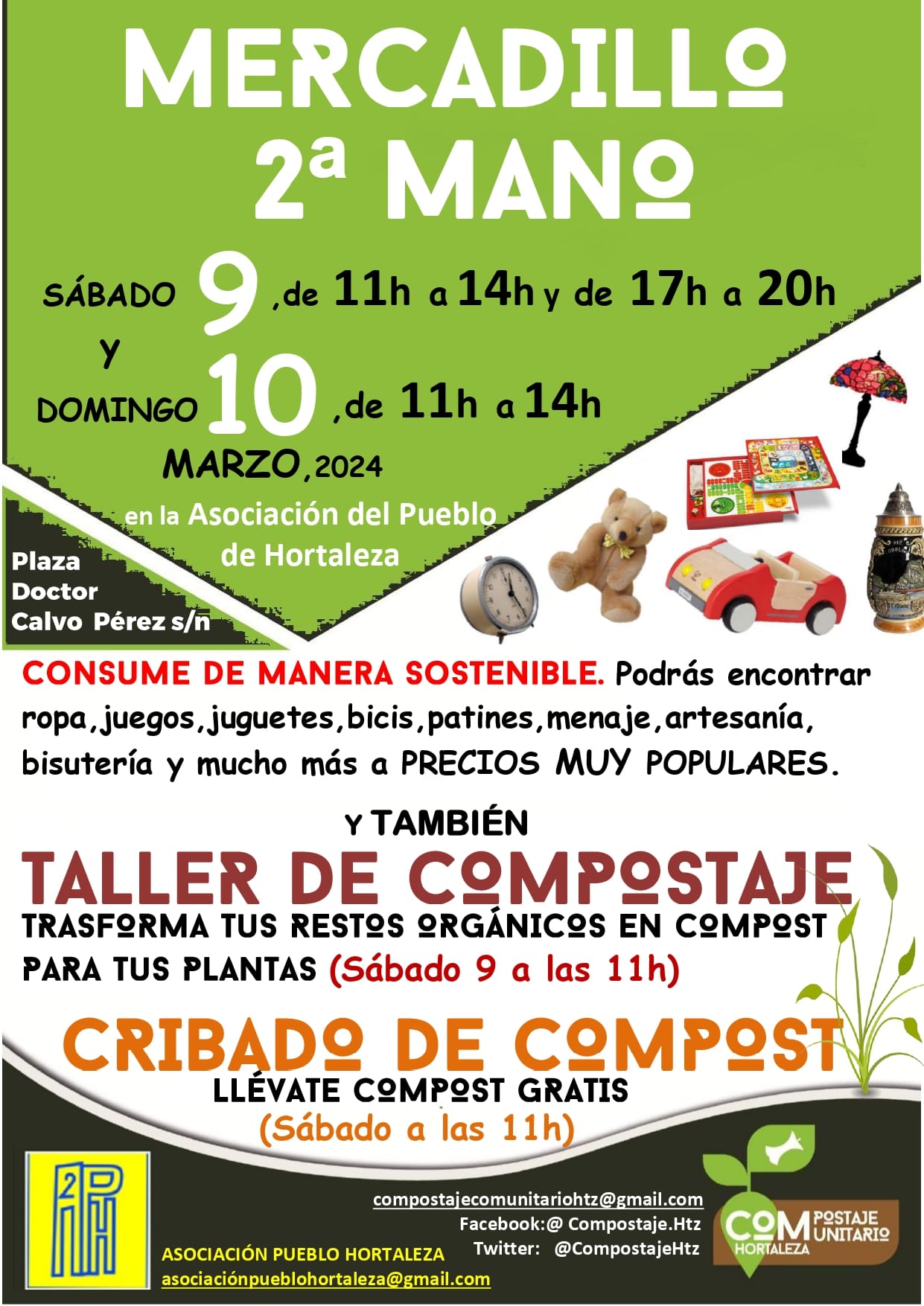 El domingo 10 de marzo de 11.00 a 14.00 horas, continúa el mercadillo de segunda mano organizado por las asociaciones Compostaje Comunitario de Hortaleza y Pueblo de Hortaleza en el área de compostaje comunitario de la plaza Doctor Calvo Pérez, s/n.