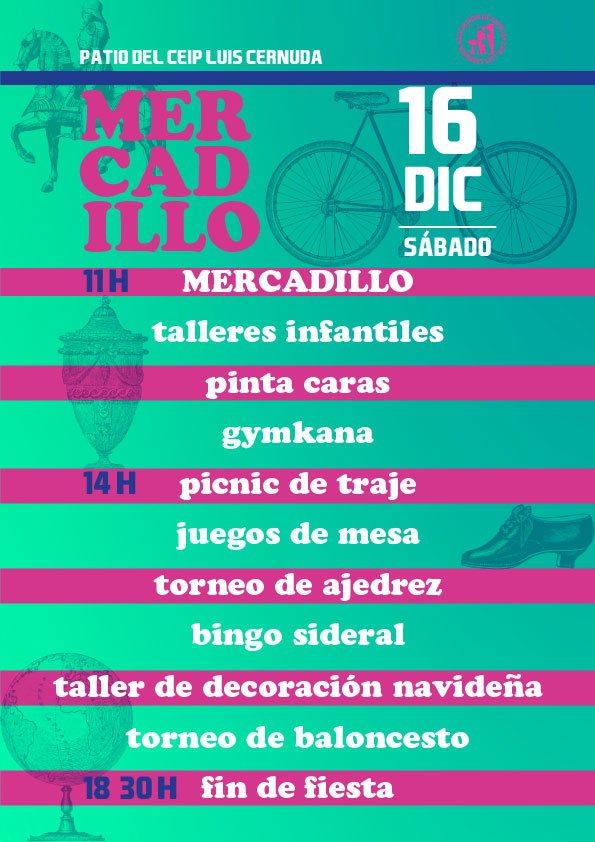 El sábado 16 de diciembre, desde las 11.00 hasta las 19.00 horas, la asociación de madres y padres del colegio público Luis Cernuda (calle Carril del Conde, 64) organiza en sus instalaciones su tradicional mercadillo navideño para ayudar a sufragar los gastos del viaje de fin de curso de sus alumnas y alumnos de Sexto.