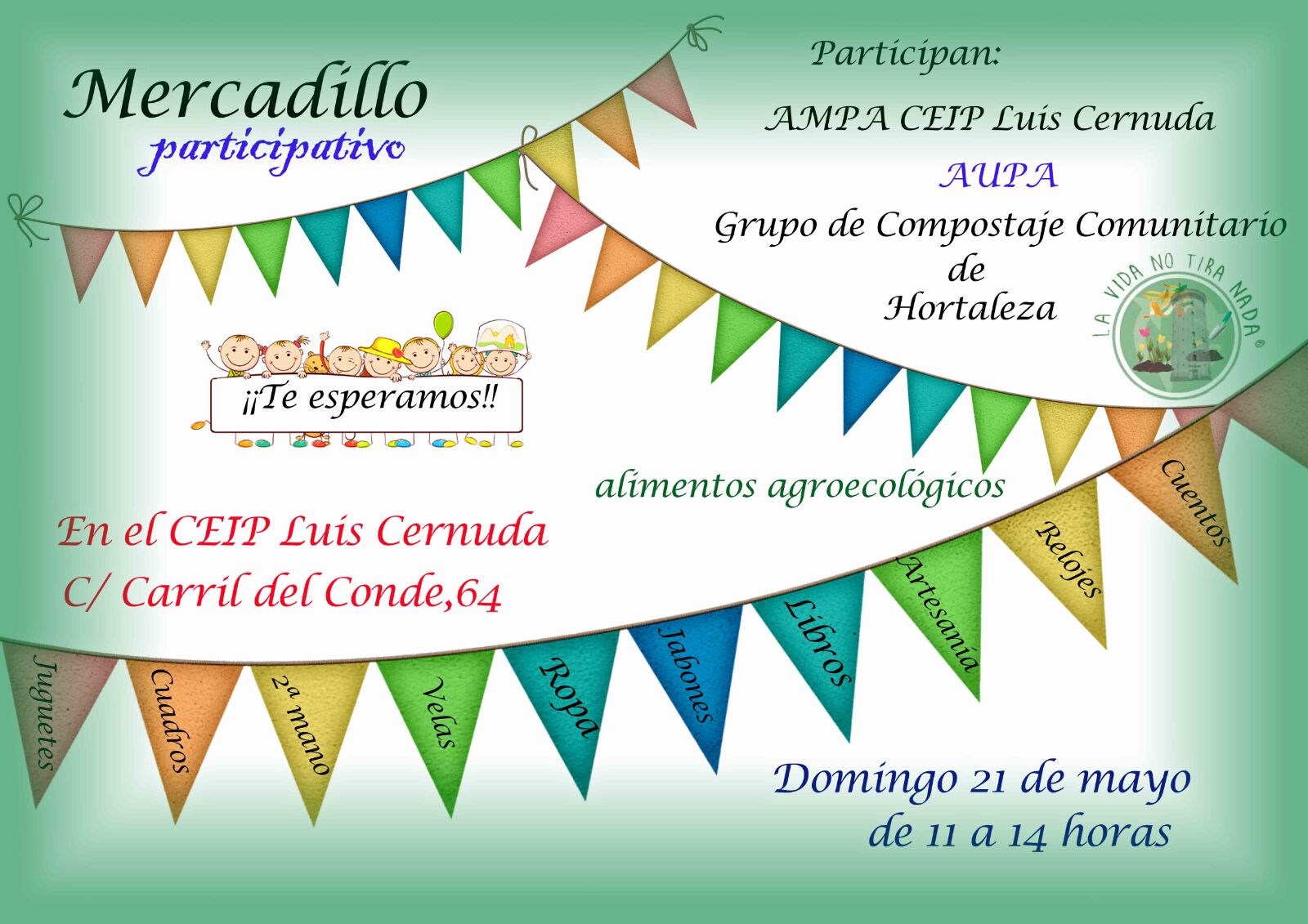 Este domingo 21 de mayo, el colegio público Luis Cernuda, en la calle Carril del Conde, acoge un mercadillo participativo organizado por el Grupo de Compostaje Comunitario de Hortaleza para recaudar fondos destinados al mantenimiento del primer área de compostaje comunitario de la ciudad de Madrid, ubicado en la calle Arequipa de nuestro barrio. El mercadillo estará instalado de 11 a 14 horas.