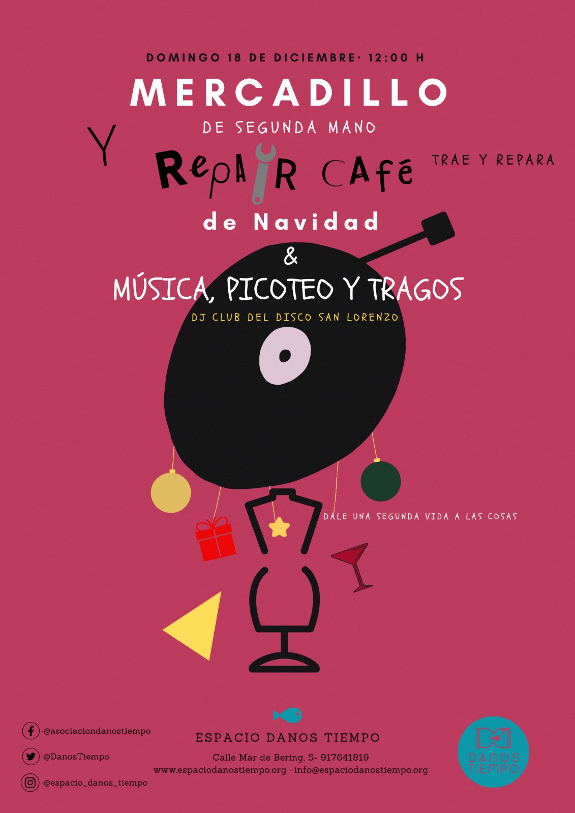 El domingo 18 de diciembre a las 12.00 horas, el Espacio Danos Tiempo (calle Mar de Bering, 5) acoge un mercadillo solidario de segunda mano, en formato sesión vermú, acompañado de un repair café: una iniciativa que persigue alargar la vida de los objetos que tenemos pudiendo para ello arreglar o repararlo.