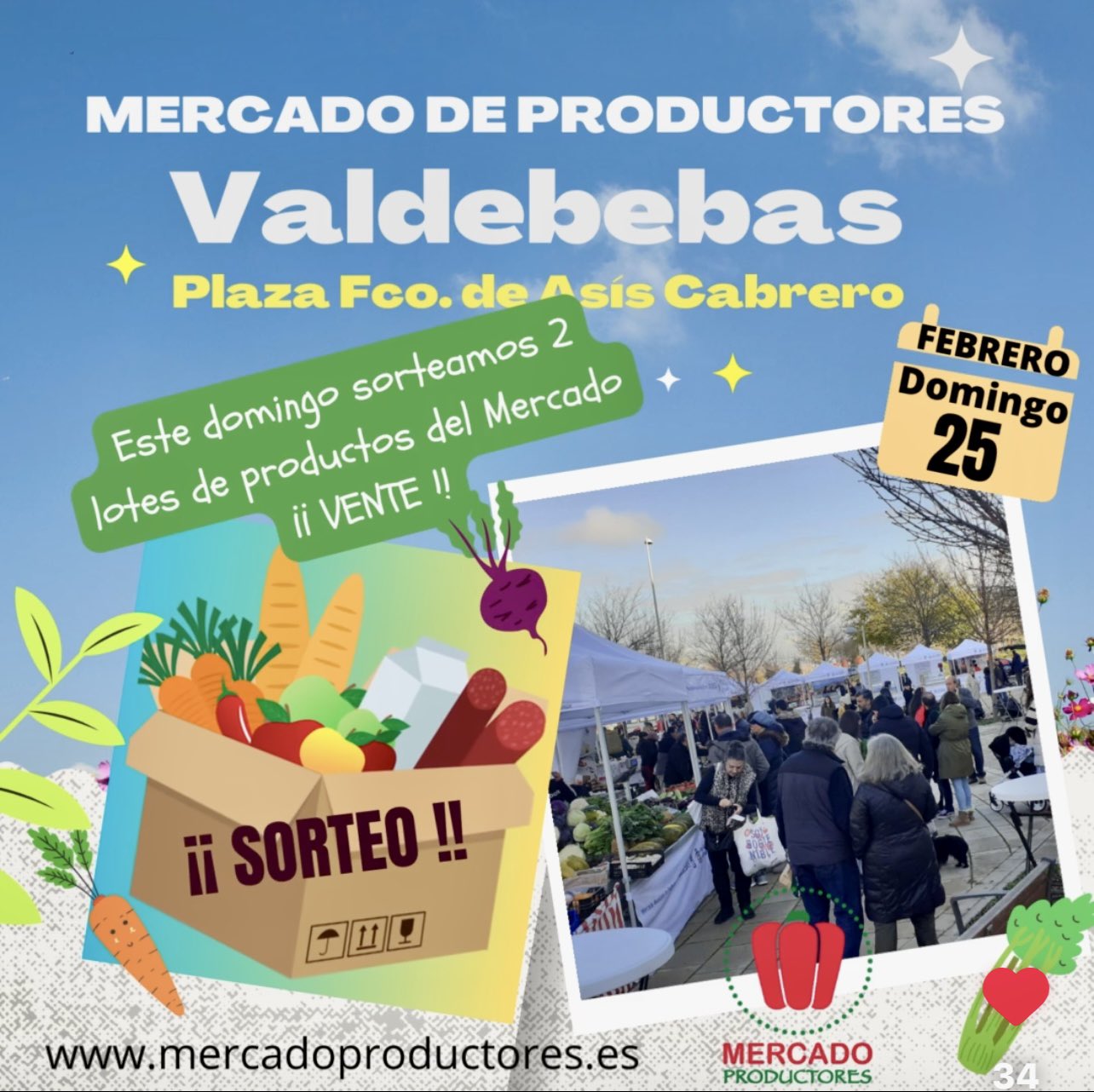 El domingo 25 de febrero desde las 10.00 hasta las 15.00 horas, se celebra el Mercado de Productores de Valdebebas de febrero de 2024, que se ubica los cuartos domingos de cada mes en la plaza de Francisco de Asís Cabrero, junto a la Avda. de Juan Antonio Samaranch. En esta edición, se van a sortear dos lotes con exquisitos productos del mercado.