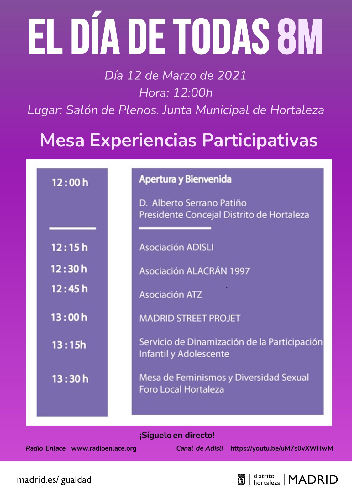 El viernes 12 de marzo a las 12.00 horas, la Unidad de Igualdad de Género y la Unidad de Participación Ciudadana y Cooperación Público Social del distrito de Hortaleza ha organizado una Mesa de Experiencias Participativas con motivo del 8M, Día Internacional de las Mujeres, que se celebrará en el salón de plenos de la Junta Municipal de Hortaleza (Carretera de Canillas, 2).