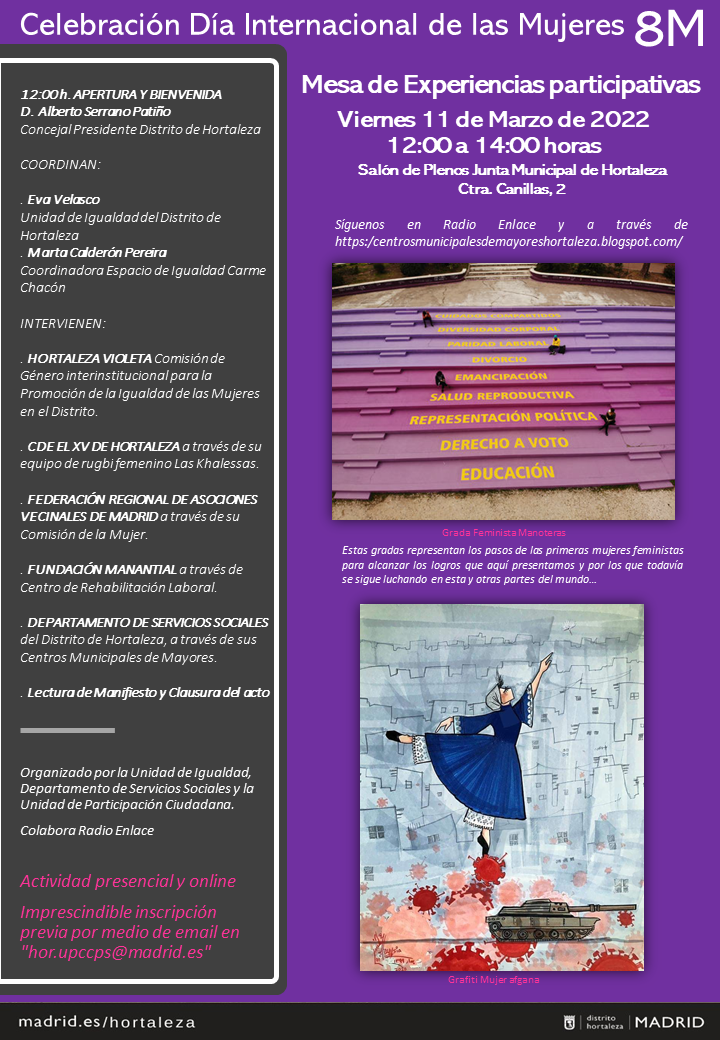 El viernes 11 de marzo a partir de las 12.00 horas, se celebra una nueva mesa de experiencias participativas con motivo del 8M, Día Internacional de la Mujer, en el salón de plenos de la Junta Municipal de Hortaleza (Carretera de Canillas, 2).