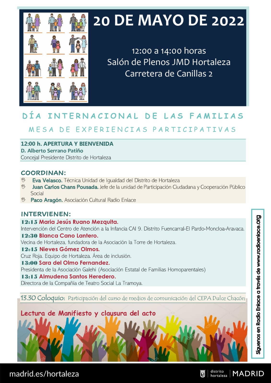 El viernes 20 de mayo a partir de las 12.00 horas, se celebra una nueva mesa de experiencias participativas con motivo del 15M, Día Internacional de las Familias, en el salón de plenos de la Junta Municipal de Hortaleza (Carretera de Canillas, 2), conforme al acuerdo del Pleno del Distrito y propuesta de la Unidad de Participación Ciudadana y la Unidad de Igualdad de Género del Distrito.