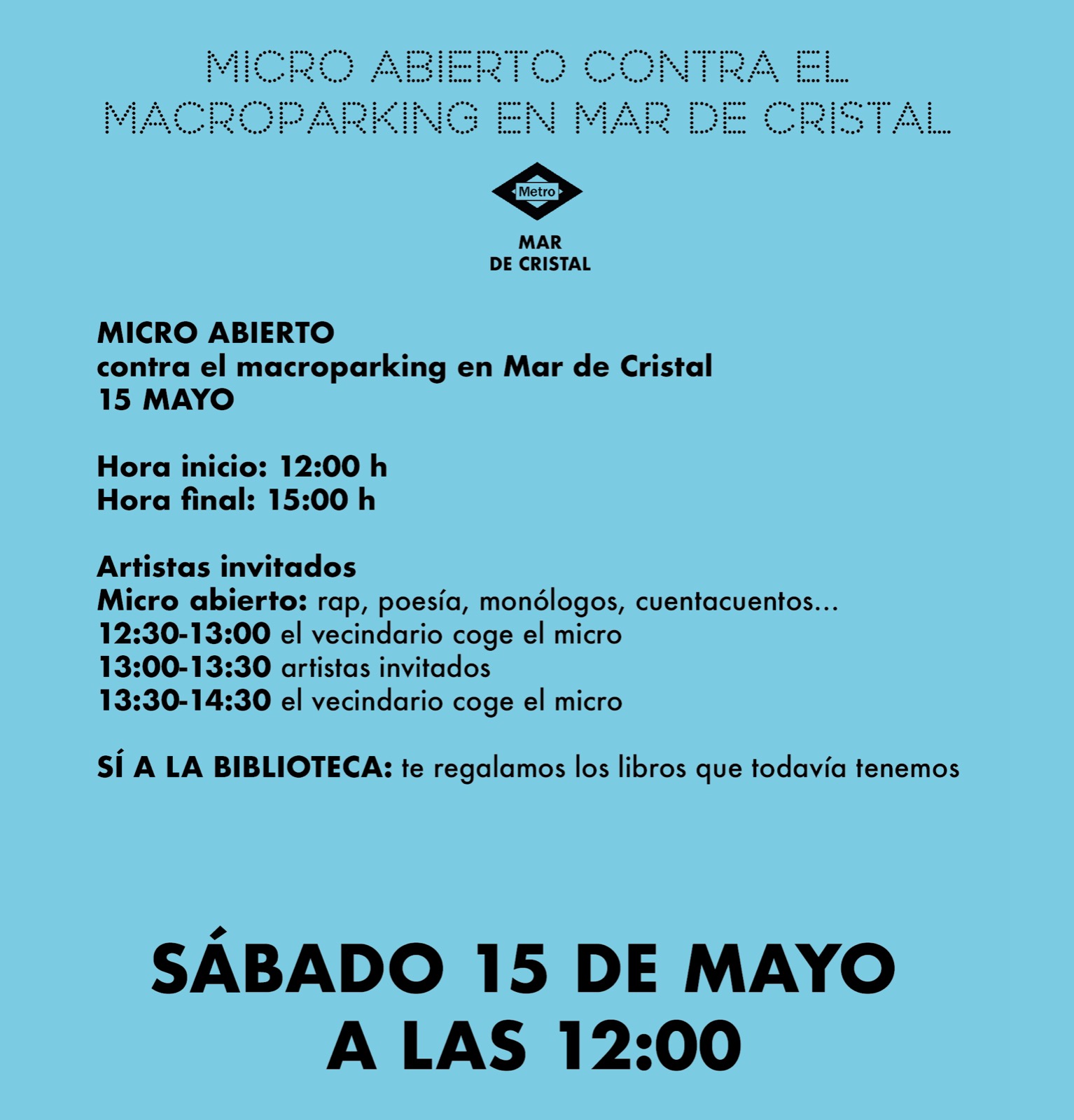 Las vecinas y vecinos de Hortaleza siguen demandando una biblioteca en la parcela de Mar de Cristal donde el Ayuntamiento pretende construir un aparcamiento disuasorio, en esta ocasión con un micro abierto contra el parking en Mar de Cristal.