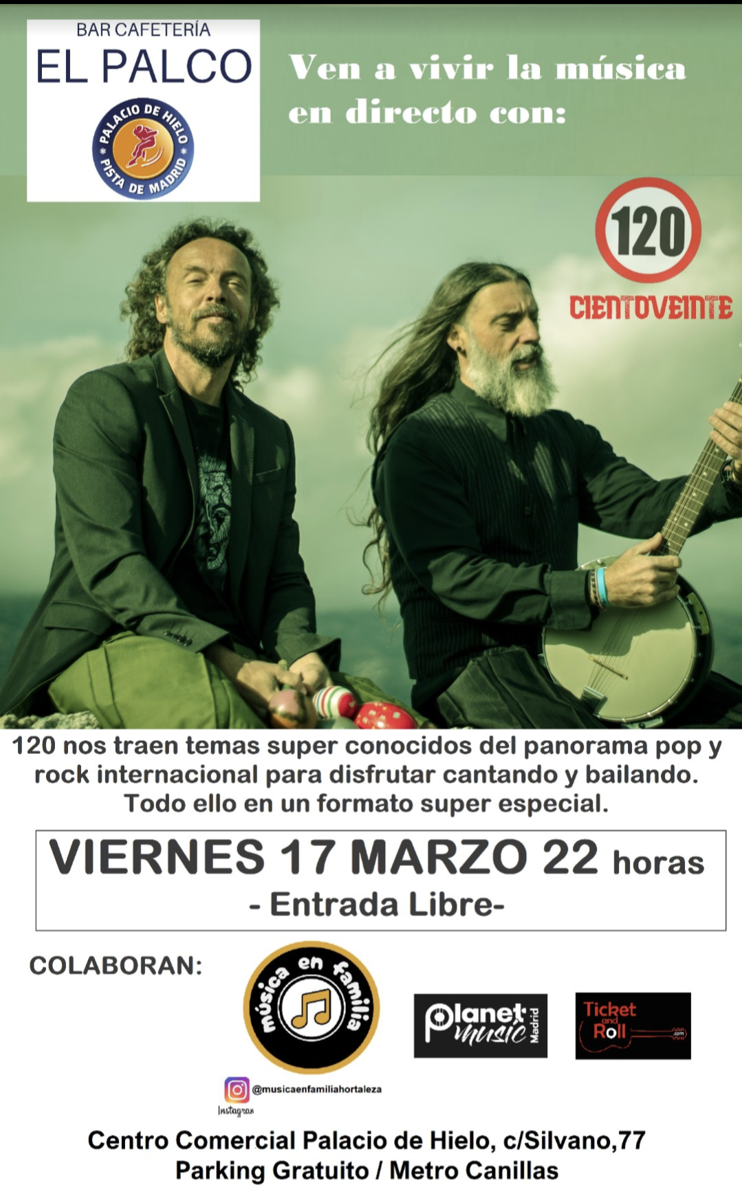 - Etiquetas del Evento:120, Bar El Palco, Cientoveinte, FamilyTribu, Música en directo en Hortaleza, Palacio de Hielo, Planet Music