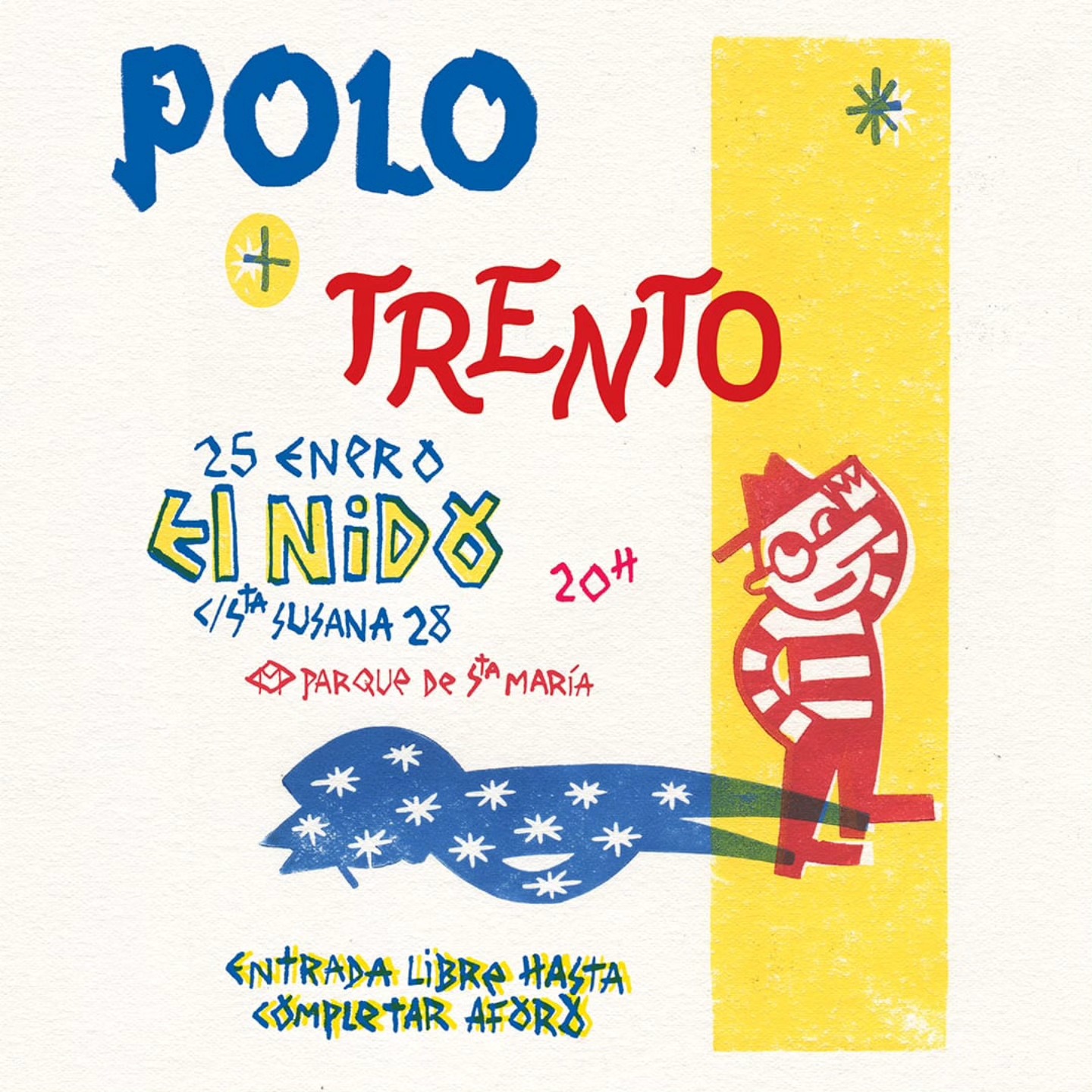 El sábado 25 de enero, a las 20.00 horas, comienza la programación cultural en el centro social El Nido (calle Santa Susana, 28 bajo) con la actuación del cantautor Trento, teloneado por Polo.
