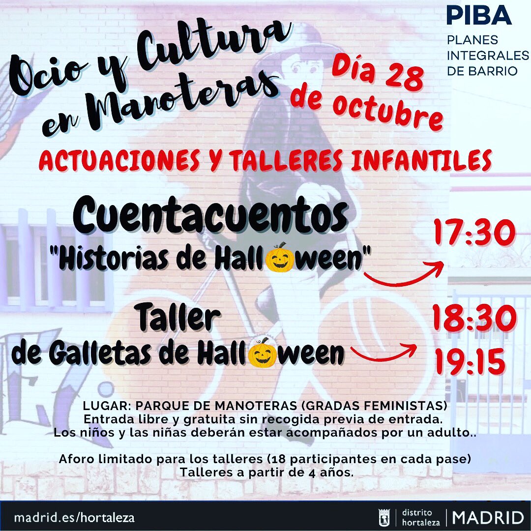 El viernes 28 de octubre vuelven las jornadas de ocio y cultura en Manoteras con actuaciones y talleres infantiles, en esta ocasión con un cuentacuentos y talleres de galletas de Halloween en el parque de Manoteras (calle Vélez Rubio, s/n) gracias a Tapa Tapita Tapón, que celebra 25 años trabajando en animaciones y como escuela de jóvenes repartiendo ilusión y entretenimiento.