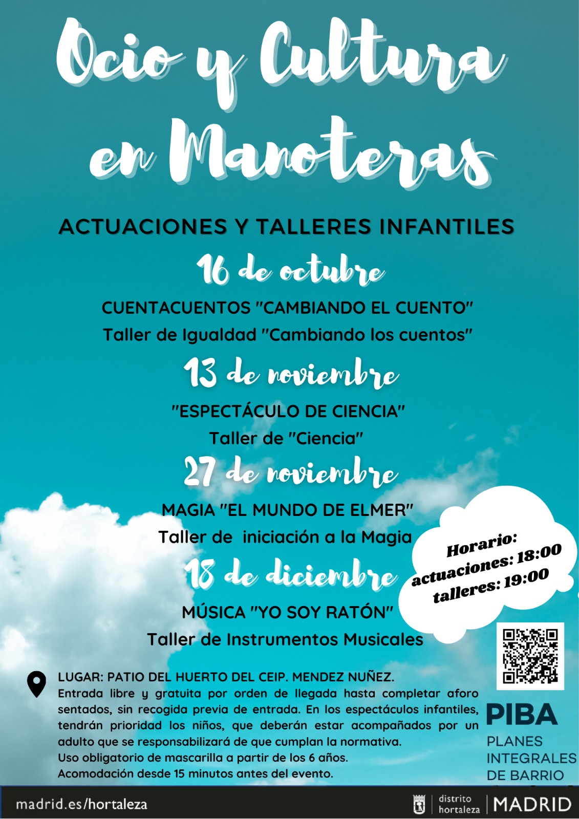 El viernes 18 de diciembre se celebra una jornada de ocio y cultura en Manoteras con actuaciones y talleres infantiles en el patio del huerto del colegio público Méndez Núñez (Alicun, 9).