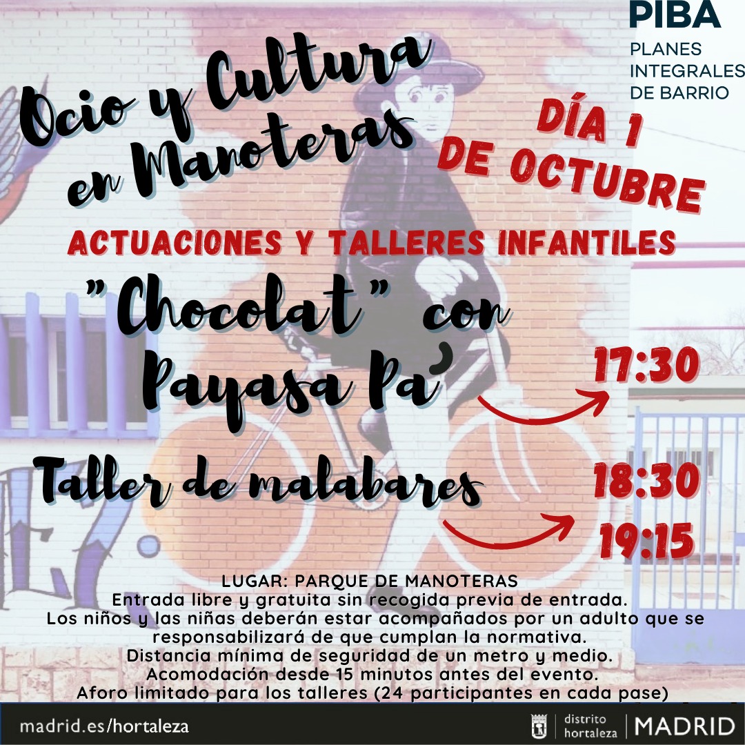 El viernes 1 de octubre se celebra una nueva jornada de ocio y cultura en Manoteras con actuaciones y talleres infantiles de la mano de Payasa Pa en el parque de Manoteras (calle Vélez Rubio, s/n).