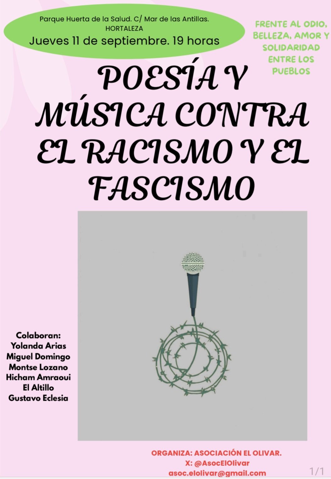 La asociación El Olivar de Hortaleza, que lleva 35 años ofreciendo techo a jóvenes sin hogar, organiza un año más en Hortaleza su recital de poesía y música contra el racismo y el fascismo, un encuentro que pretende fomentar «frente al odio, belleza, amor y solidaridad entre los pueblos» el jueves 11 de septiembre, a las 19.00 horas, en el parque Huerta de la Salud (calle Mar de las Antillas, 8).