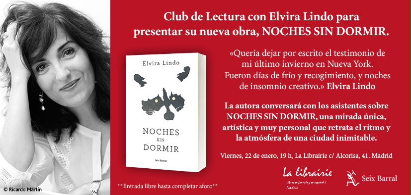La escritora Elvira Lindo presenta este viernes 22 de enero a las 19 horas su nueva novela Noches sin dormir en La Libraire de Hortaleza, en la calle Alcorisa 41 (Metro Canillas). La entrada a la presentación es gratuita.
