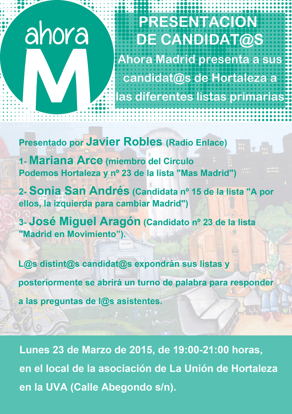 Este lunes 23 de marzo, a las 19 horas, los tres candidatos del barrio a las primarias de Ahora Madrid protagonizan un debate abierto al público en el local de la asociación La Unión en la UVA de Hortaleza (calle Abegondo s/n). En el acto participarán: