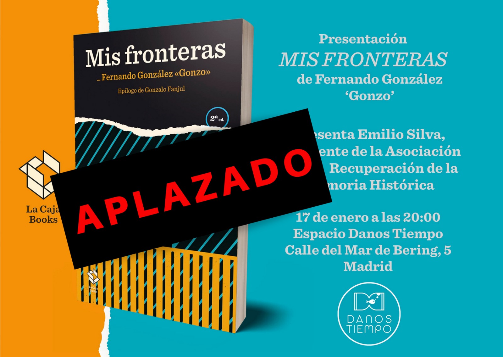 El próximo viernes 17 de enero, de 20.00 a 21.30 horas, el periodista Fernando González Gonzo, del programa de televisión Salvados, presentará su último libro Mis fronteras en el Espacio Danos Tiempo (Mar de Bering, 5), junto con Emilio Silva, presidente de la Asociación para la Recuperación de la Memoria Histórica.
