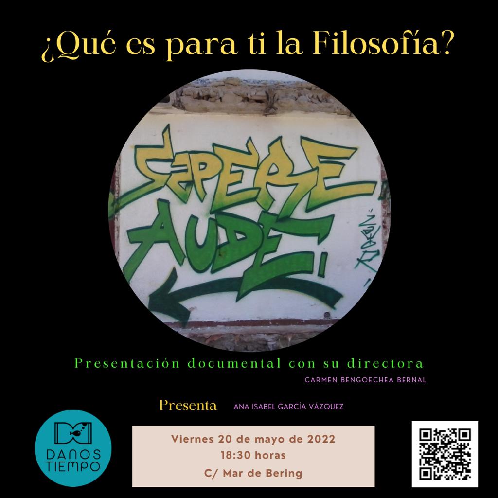 ¿Qué es Sapere aude? Un documental que muestra la opinión de varias personas sobre qué es la filosofía y para qué sirve, donde han participado Ana Isabel García Vázquez –que también presenta el acto– y su hija Sofía y Damián, Blanca, Hugo, María, Carlos, Marieta con Sofía y Adam, Luis, Sonia, Pilar, Félix y Aarón García Peña.