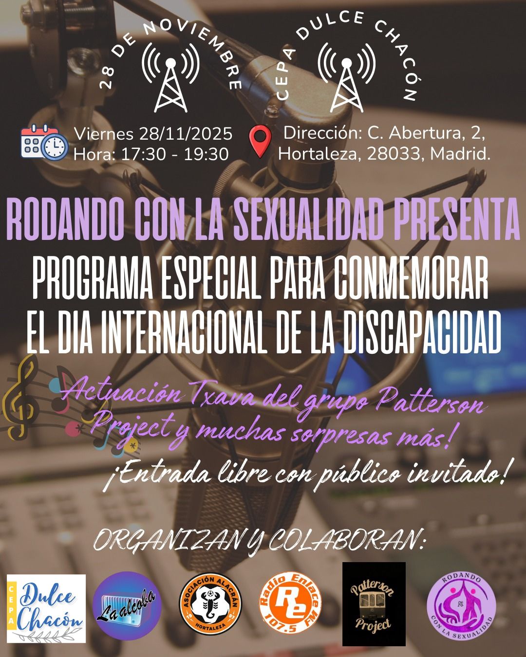 El viernes 28 de noviembre a las 17.30 horas, la asociación Rodando con la Sexualidad organiza un programa de radio especial por el Día Internacional de la Discapacidad en el Centro de Educación de Personas Adultas Dulce Chacón (calle Abertura, 2).