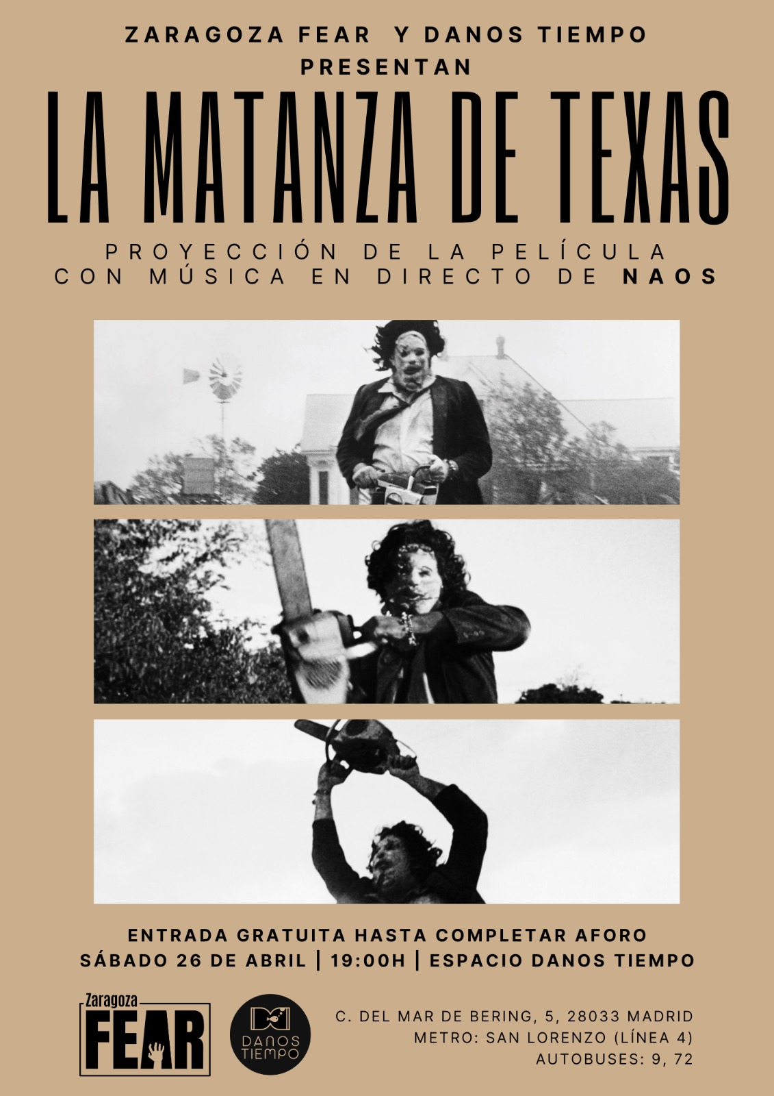 El sábado 26 de abril a las 19.00 horas, el Espacio Danos Tiempo acoge la proyección de la película estadounidense La matanza de Texas (1974), con música en directo de Naos, gracias a Zaragoza Fear.