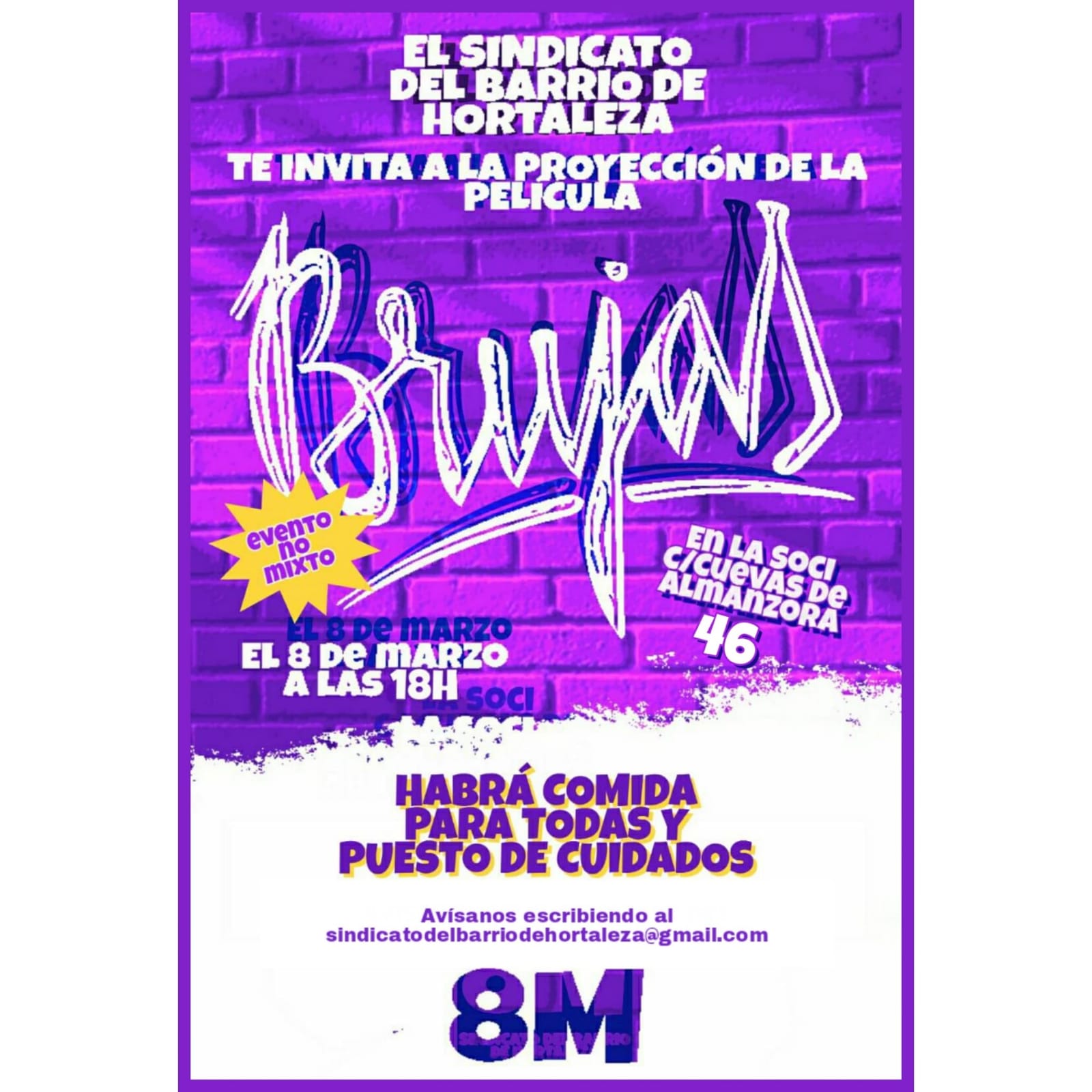 El domingo 8 de marzo a partir de las 18.00 horas, el Sindicato del Barrio de Hortaleza invita a las vecinas del barrio a un evento no mixto en La Soci de Manoteras (Cuevas de Almanzora, 46), donde se realizará la proyección de la película ‘Brujas’, de Álvaro Fernández Armero.