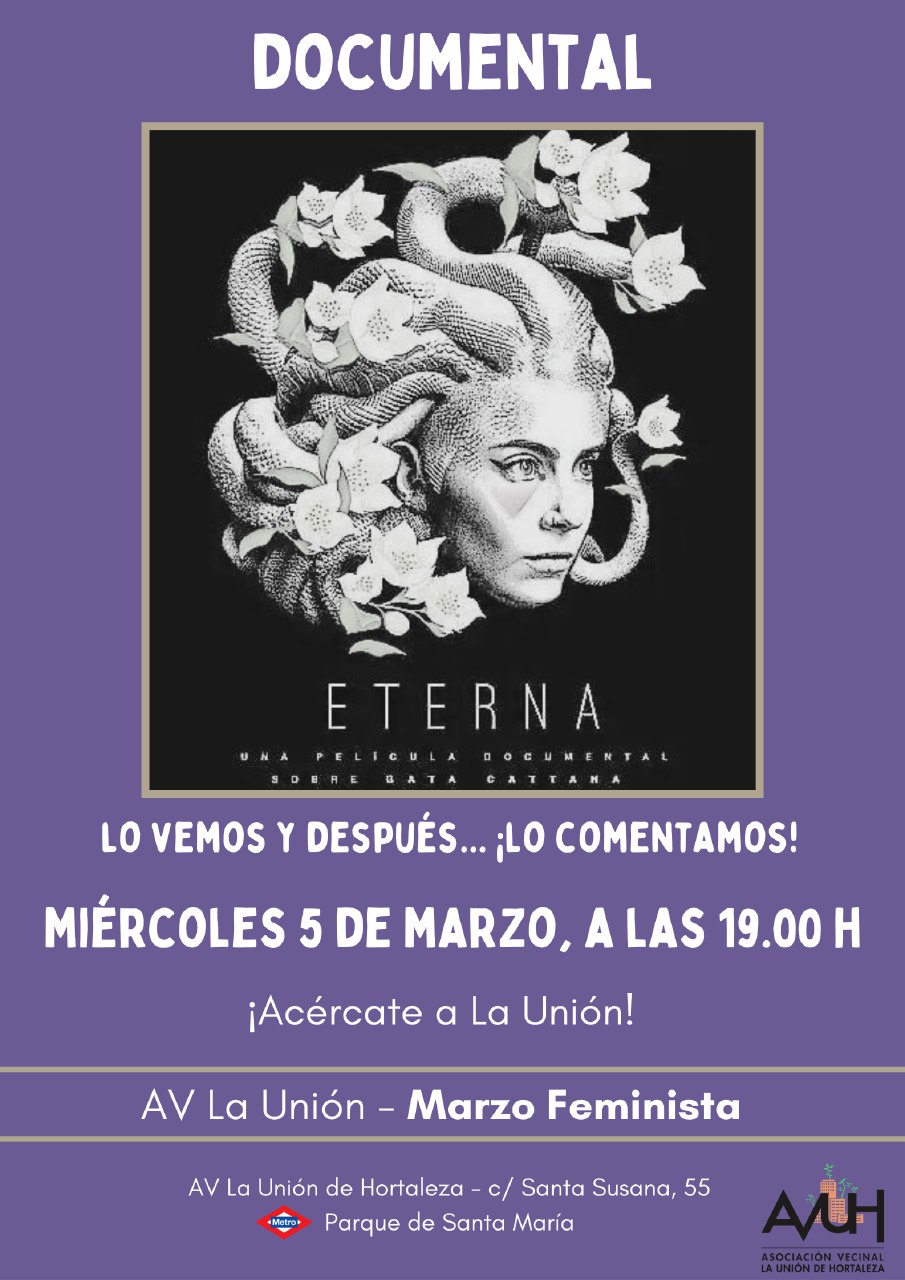 El miércoles 5 de marzo a las 19.00 horas, continúa la programación especial por el Día Internacional de la Mujer del mes de marzo de La Unión de Hortaleza con la proyección del documental Eterna en la sede de la asociación vecinal (calle Santa Susana, 55 posterior), a la que seguirá un debate posterior.