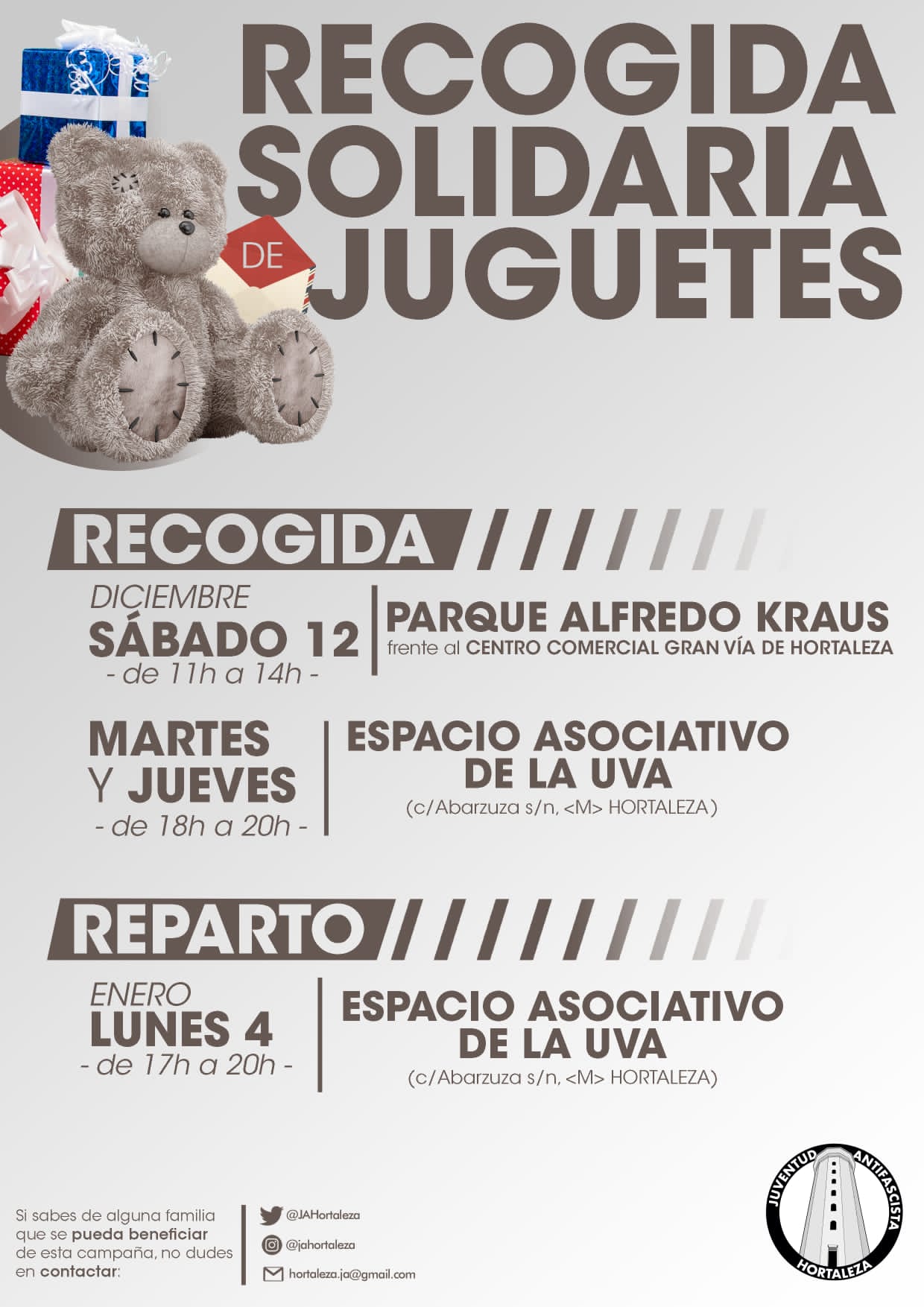 El sábado 12 de diciembre de 11.00 a 14.00 horas, el colectivo Juventud Antifascista de Hortaleza organiza una recogida solidaria de juguetes en el parque Alfredo Kraus (Mar Adriático, 5), frente al centro comercial Gran Vía de Hortaleza.