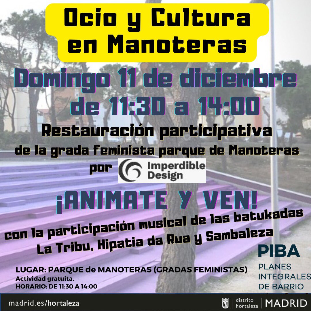 El domingo 11 de diciembre, desde las 11.30 hasta las 14.00 horas, se anima al vecindario a participar en la restauración de las gradas feministas del parque de Manoteras (Vélez Rubio, s/n) gracias a Imperdible Design.