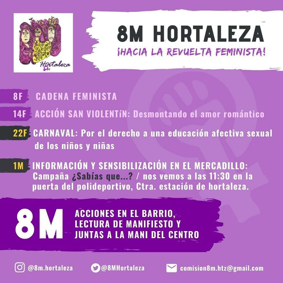 El jueves 27 de febrero a las 19.00 horas, se celebra una nueva reunión de la Comisión 8M Hortaleza en el Espacio de Igualdad Carme Chacón (Matapozuelos, 2), que está ultimando los detalles de para la próxima Huelga Feminista del 8M.
