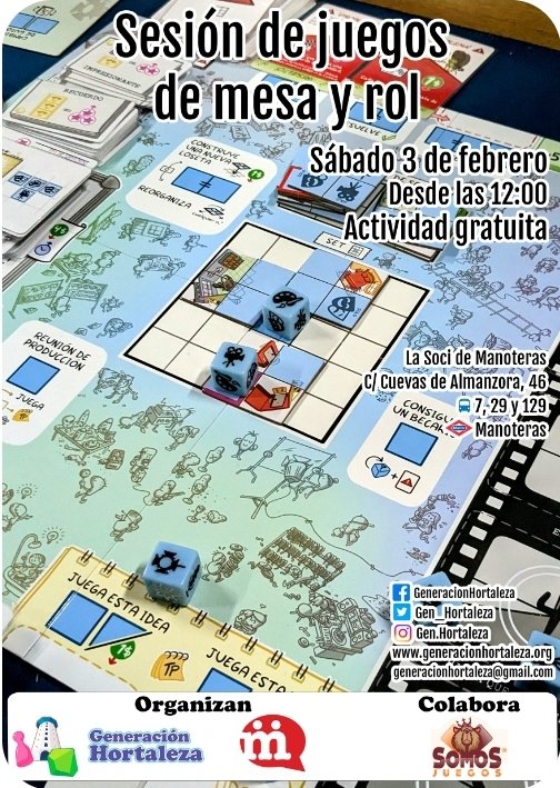 El sábado 3 de febrero desde las 12.00 horas, se celebra una nueva sesión de juegos de mesa en la Soci de Manoteras(Cuevas de Almanzora, 46) organizada por Generación Hortaleza, en colaboración con Somos Juegos.