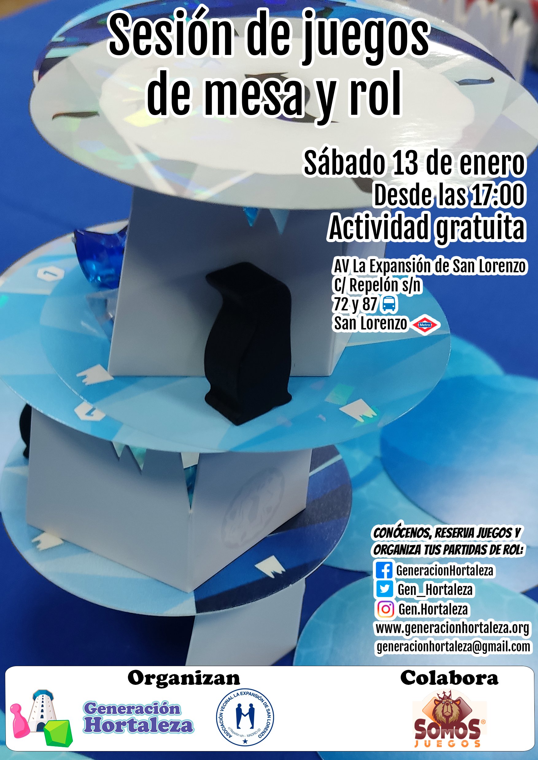 El sábado 13 de enero a las 17.00 horas, la asociación vecinal La Expansión de San Lorenzo (calle Repelón, 6) acoge una nueva sesión vespertina de juegos de mesa organizada por Generación Hortaleza, en colaboración con Somos Juegos.