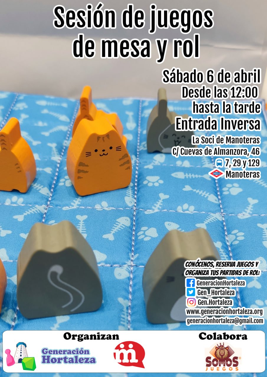 El sábado 6 de abril desde las 12.00 horas, se celebra una nueva sesión de juegos de mesa y rol en Manoteras en la sede de la Soci de Manoteras (Cuevas de Almanzora, 46) organizada por Generación Hortaleza, en colaboración con Somos Juegos.
