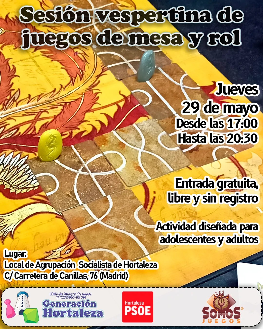 El jueves 29 de mayo desde las 17.00 horas, gracias a Generación Hortaleza, en colaboración con Somos Juegos, se organiza una nueva sesión vespertina de juegos de mesa y rol en PSOE Hortaleza, es decir, en el local de la Agrupación Socialista de Hortaleza (Carretera de Canillas, 76).
