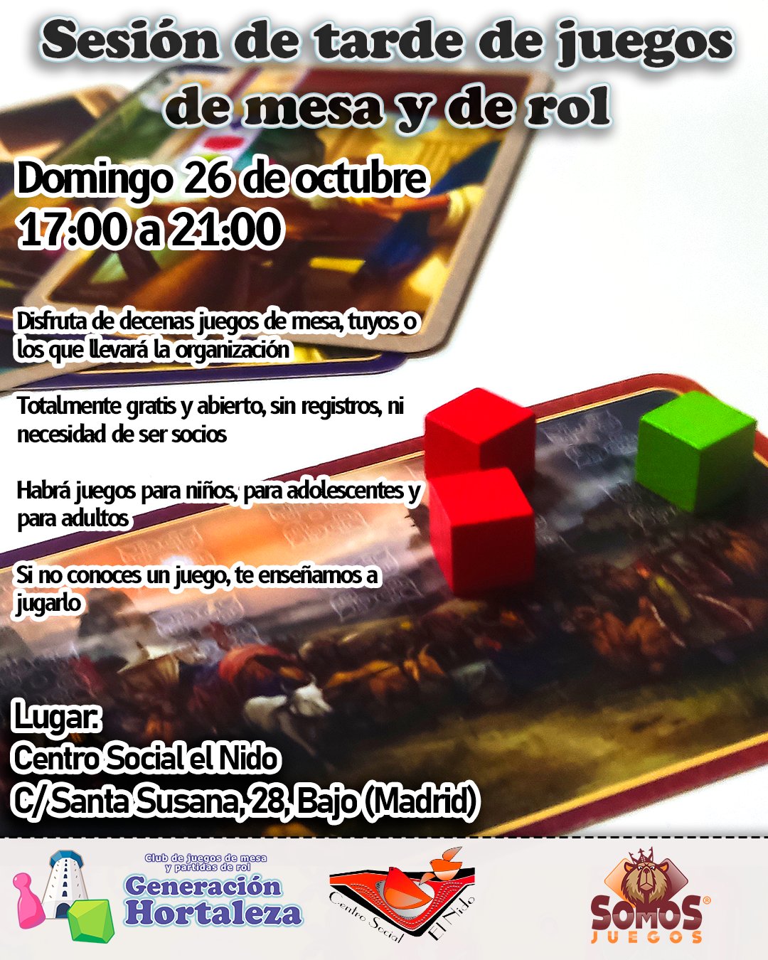 El domingo 26 de octubre desde las 17.00 horas hasta las 21.00 horas, gracias a Generación Hortaleza, en colaboración con Somos Juegos, se organiza una nueva sesión de tarde de juegos de mesa y de rol en el centro social El Nido (calle Santa Susana, 28 bajo).