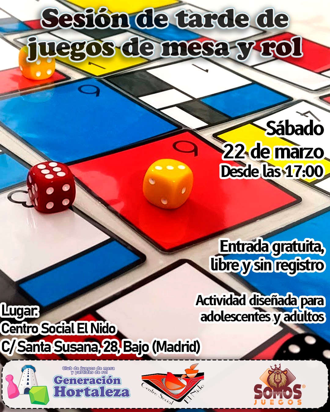 El sábado 22 de marzo a las 17.00 horas, gracias a Generación Hortaleza, en colaboración con Somos Juegos, se organiza una nueva sesión de tarde de juegos de mesa y rol en el centro social El Nido (Santa Susana, 28 bajo).