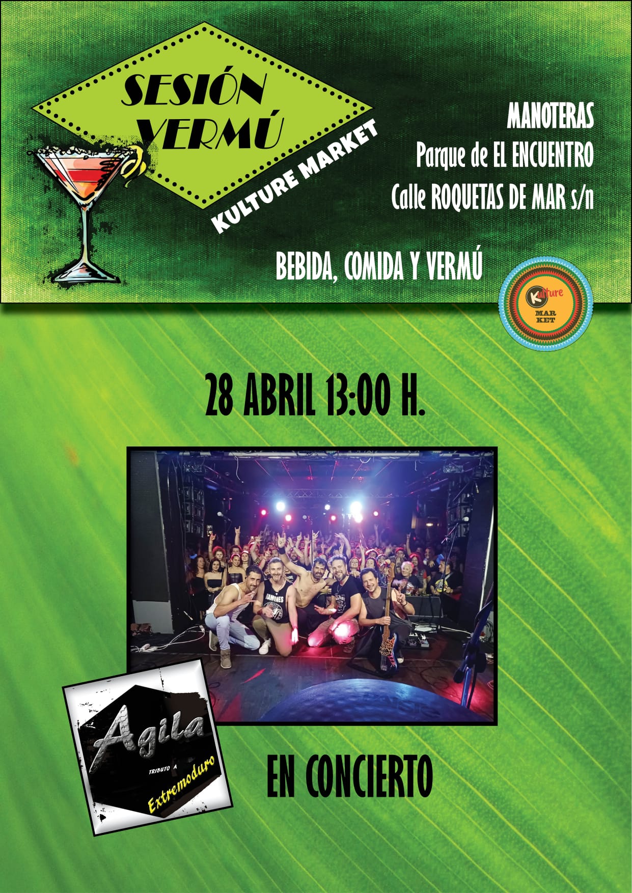 El domingo 28 de abril a las 13.00 horas, la asociación Kulture Market continúa su calendario primaveral con una sesión vermú en el parque de El Encuentro (calle Roquetas de Mar, s/n) en el barrio de Manoteras.