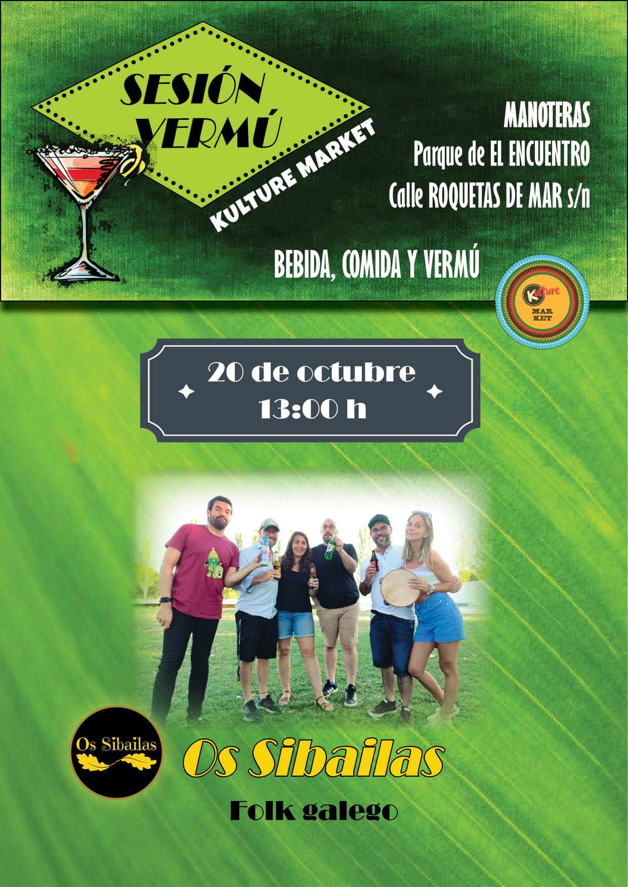 El domingo 20 de octubre a las 13.00 horas, la asociación Kulture Market celebra una nueva sesión vermú con el concierto de folk galego de Os Sibailas en el parque de El Encuentro (calle Roquetas de Mar, s/n) en el barrio de Manoteras.