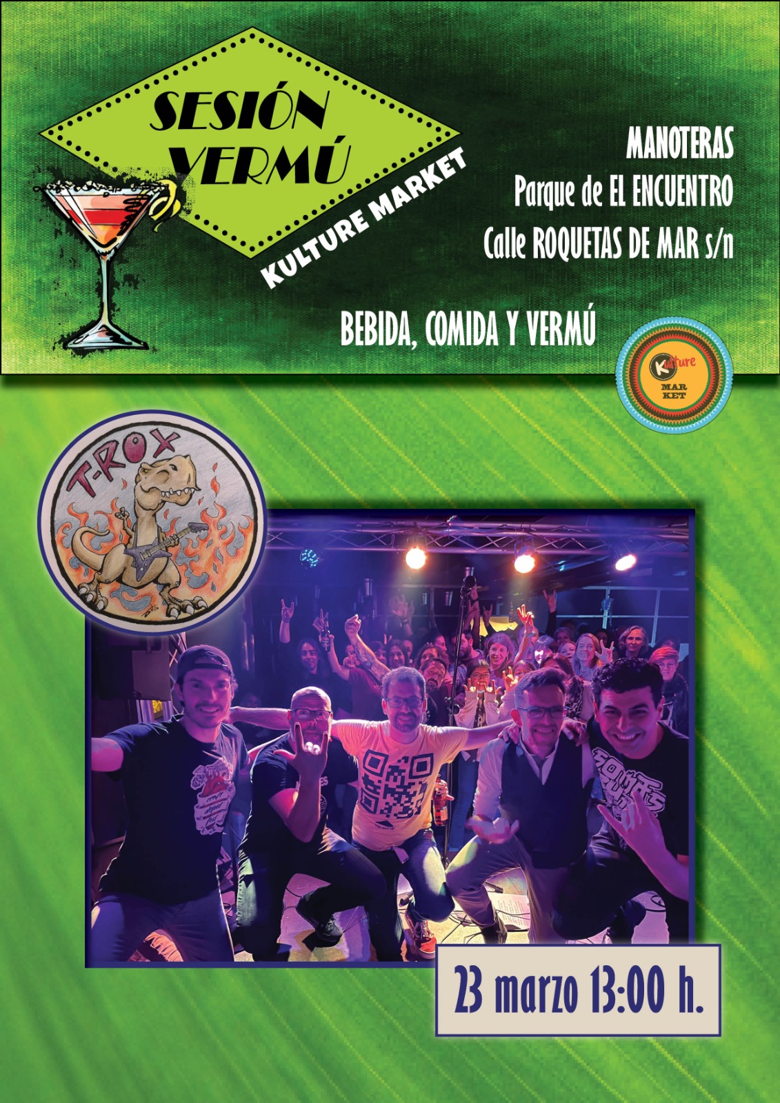 El domingo 23 de marzo a las 13.00 horas, la asociación Kulture Market celebra una nueva sesión vermú con el concierto de rock de T-Rox en el parque de El Encuentro (calle Roquetas de Mar, s/n) en el barrio de Manoteras.