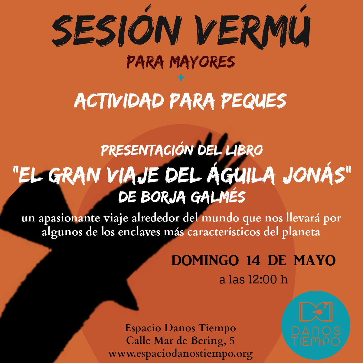 El domingo 14 de mayo a las 12 horas disfruta de un vermú mientras los/as peques conocen las aventuras del águila Jonás en el Espacio Danos Tiempo. La actividad consiste en una lectura breve de un fragmento del libro «El gran viaje del Águila Jonás”, de Borja Galmes Belmonte, y la realización de un juego a través del cual podrán conocer el  gran viaje y aventuras del Águia Jonas. Las personas que quieran podrán adquirir el libro en el mismo local de la asociación.