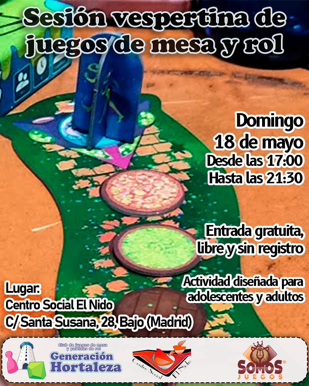 El domingo 18 de mayo desde las 17.00 horas, gracias a Generación Hortaleza, en colaboración con Somos Juegosse organiza una nueva sesión vespertina de juegos de mesa y rol en el centro social El Nido (Santa Susana, 28 bajo).