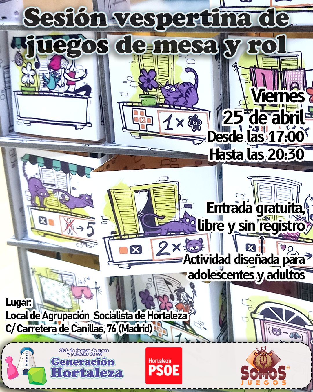 El viernes 25 de abril desde las 17.00 horas, gracias a Generación Hortaleza, en colaboración con Somos Juegosse organiza una nueva sesión vespertina de juegos de mesa y rol en PSOE Hortaleza, es decir, en el local de la Agrupación Socialista de Hortaleza (Carretera de Canillas, 76).