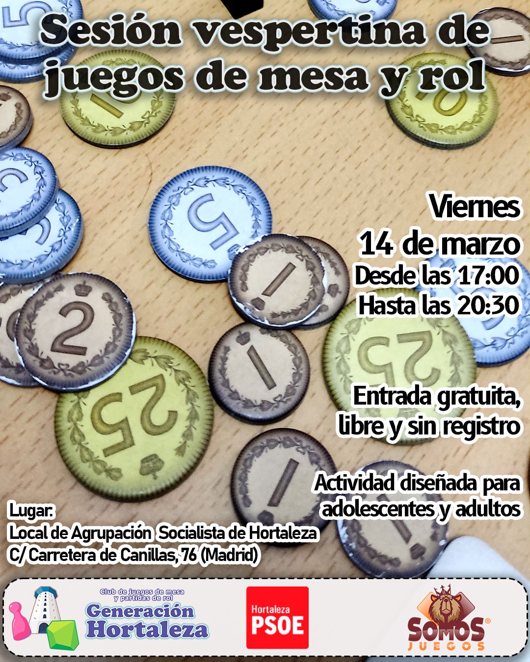 El viernes 14 de marzo a las 17.00 horas, gracias a Generación Hortaleza, en colaboración con Somos Juegos, se organiza una nueva sesión vespertina de juegos de mesa y rol en PSOE Hortaleza, es decir, en el local de la Agrupación Socialista de Hortaleza (Carretera de Canillas, 76).