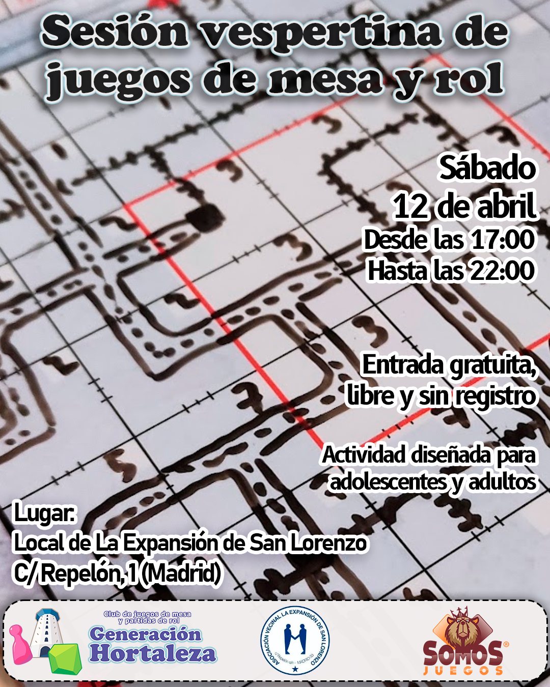 El sábado 12 de abril desde las 17.00 horas hasta las 22.00 horas, se celebra una nueva sesión vespertina de juegos de mesa y rol en San Lorenzo en la sede de la asociación vecinal La Expansión de San Lorenzo (calle Repelón, 6) organizada por Generación Hortaleza, en colaboración con Somos Juegos.