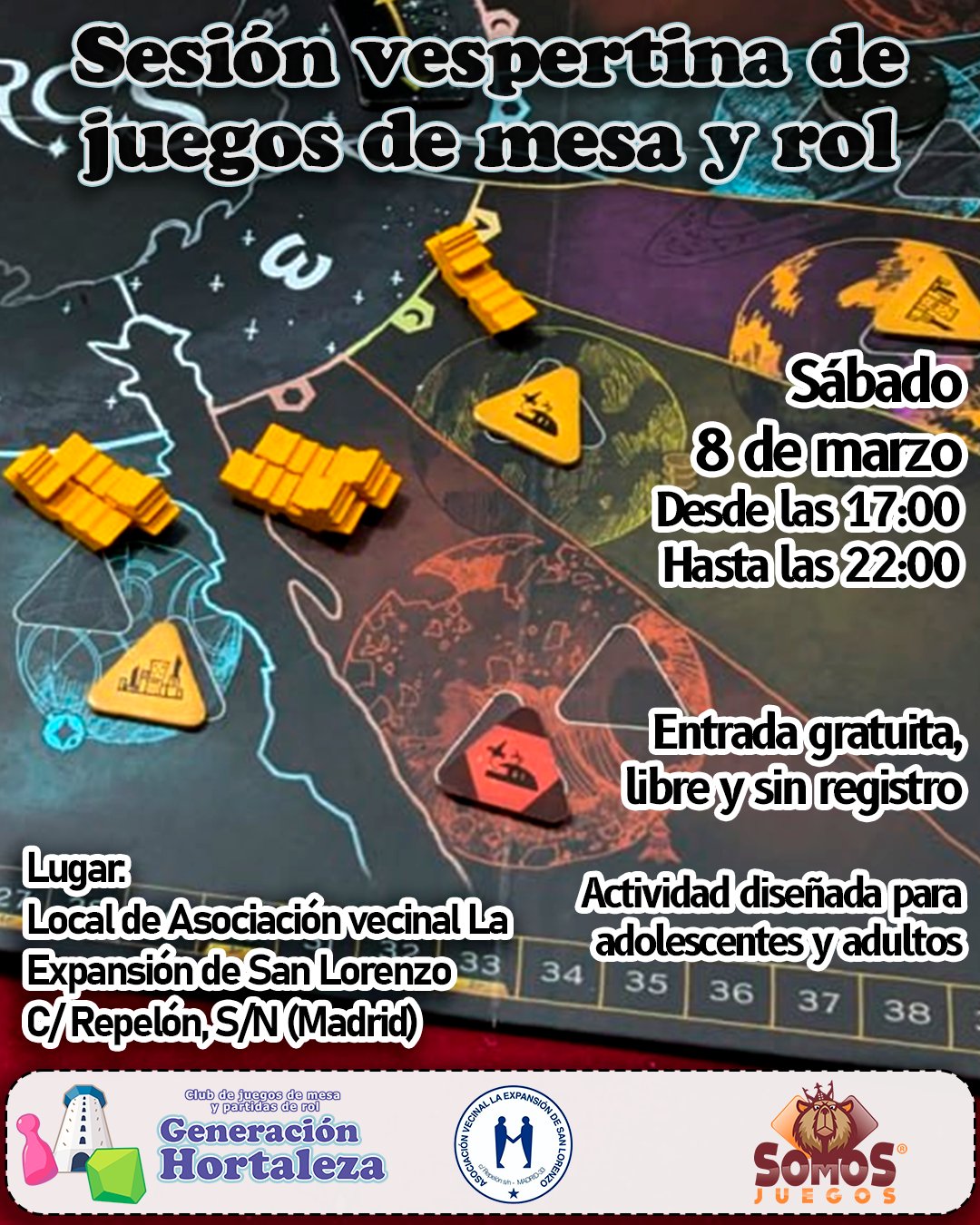 El sábado 8 de marzo desde las 17.00 horas, se celebra una nueva sesión vespertina de juegos de mesa y rol en San Lorenzo en la sede de la asociación vecinal La Expansión de San Lorenzo (calle Repelón, 6) organizada por Generación Hortaleza, en colaboración con Somos Juegos.
