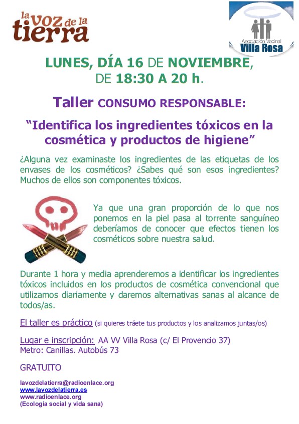 GratuitoLa asociación vecinal Villa Rosa organiza, junto al programa de Radio Enlace La Voz de la Tierra, un taller sobre consumo responsable para identificar ingredientes tóxicos en la cosmética y productos de higiene que se celebrará el lunes 16 de noviembre, a las 18:30 horas, en el local de la asociación, en la calle El Provencio 37.
