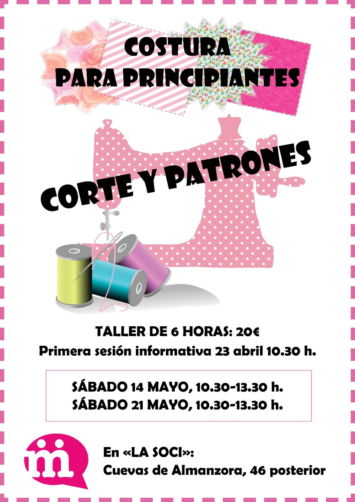 Este sábado 21 de mayo, desde las 10.30 hasta las 13.30 horas, se celebra la segunda sesión del taller de costura para principiantes que organiza la Soci de Manoteras en su sede de la calle Cuevas de Almanzora, número 46 posterior.